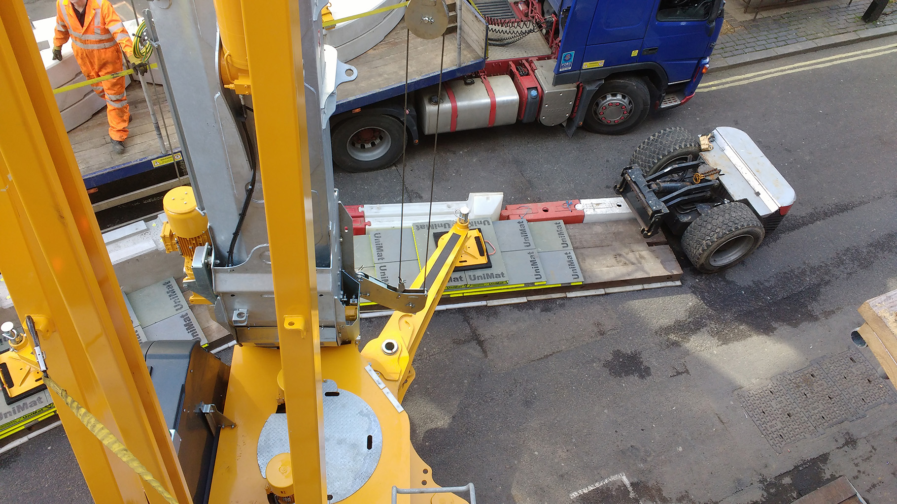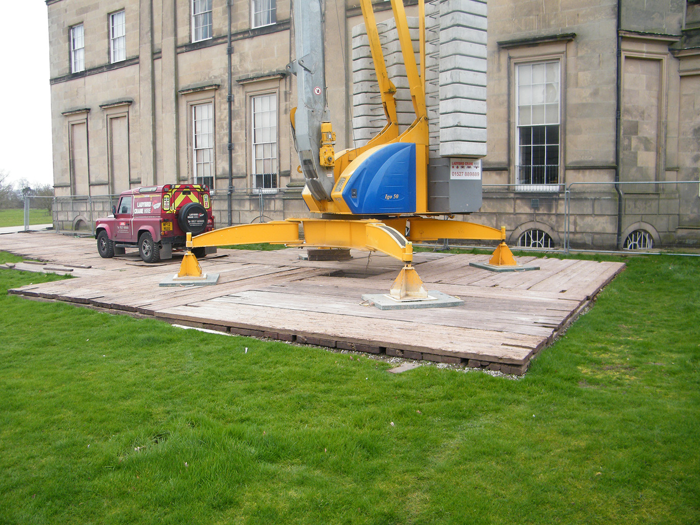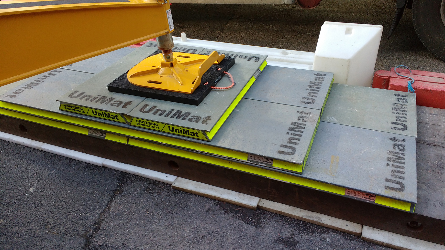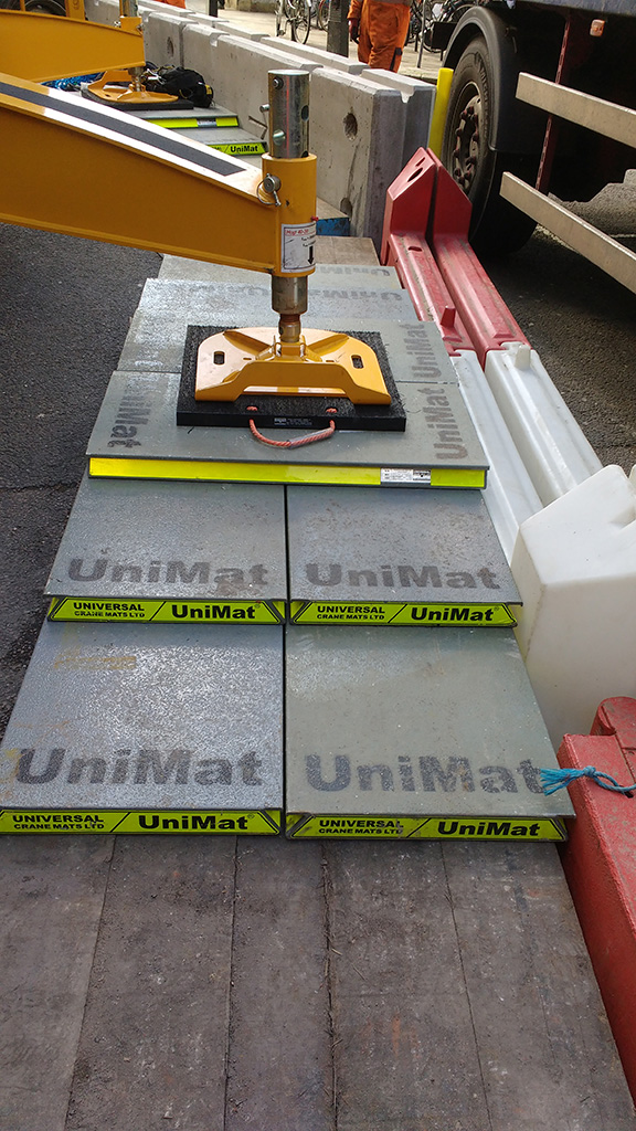 For self-erecting cranes and city cranes on cruciform bases, rigging mats are used to reduce the pressure across the ground. Whilst most sites will design and construct a concrete pad, this is not always possible, or economical; for example where cranes are sited on roads or parkland. Mats of any size are available to reduce the crane’s point loadings down as far as required. Our most popular size mats are included in our standard quotations and larger options are priced on request.